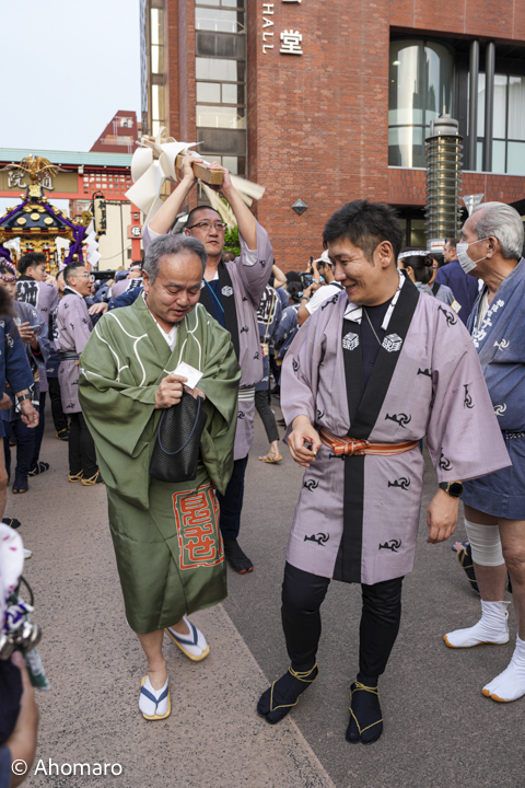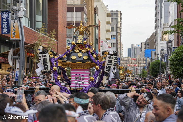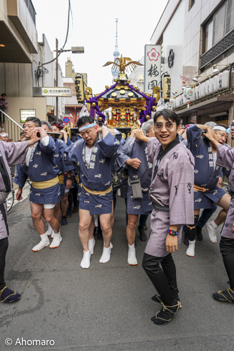 三社祭が、いよいよ始まりました。 浅草が一年で最も熱く燃える季節の到来です。昨日は、その幕開けを飾る華やかな行事「大行列」が行われました。お囃子屋台にびんざさら舞、そして白鷺の舞。浅草の街を悠然と練り歩くその光景は、まるで江戸の粋が現代に甦ったかのようでしたよ。これだけで胸が高鳴るのに、夕方からは、浅草六ヶ町(浅一三栄、浅草東、仲見世、浅草公園、浅草中央、浅草西)の連合宵宮も始まり、まさに祭り一色の一日となったのでした。 あほまろは、仲見世町会の袢纏をお借りして、気合いだけは一人前に、みなさんの勇姿をカメラに収めてまいりましたよ。一年待ちに待った三社祭。普段はお店の仕事でお忙しい町内の皆さまとも、気兼ねなく笑顔で挨拶を交わせるのも、この祭りの醍醐味というものです。いやはや、神輿よりも嬉しい再会もあるのですよ。 浅草に越してきて早や26年。気がつけば、あほまろもすっかり浅草人。顔なじみも増え、町を歩けばあちこちから、「あほまろさん!」と声がかかる。最初は「変な名前だね」と笑われたペンネームも、いまや立派な町内の名刺代わりになっているのですよ。そんなことで、和気藹々としたご近所づきあいを楽しんでいるのです。 夕暮れの中、各町会を出発した浅草六ケ町の神輿は、浅草公会堂前に集結。今年の当番町会、浅一三栄町会長の挨拶の後、六区、すしや通り、食通街、浅草中央通り、そして伝法院通りへと繰り出していきました。響き渡るお囃子と「ソャ! ソャ!」の掛け声が、町の隅々まで熱気を運んでいく、その様は、まさに江戸の血が騒ぐ瞬間なのでした。 しかしながら、あほまろにも抗えぬものがひとつ。それは年齢による体力の衰え。いつまでも若いと思い込んでいるのは、テレビの中の俳優さんたちだけで十分。というわけで、撮影の途中、すしや通りでそっと離脱し、弟子たちに後を託して戻ってまいりましたよ。老いては子に(弟子に)従え、ということでしょうかね。 さて本日は、我が雷門四ヶ町の連合渡御が予定されています。あほまろもできる限り着いて行くつもりですが、天気がどうも怪しい。雨が強くなったら、またしても弟子たちにバトンタッチして、のんびり帰るかもしれません。写真は逃げませんからね、無理は禁物ということで。 三社祭の氏子町内は、南部十六ヶ町、東部十二ヶ町、西部十六ヶ町の三つに分かれた、実に四十四ヶ町。明日の最終日には、浅草神社の御神体を祀った三基の大神輿「一之宮、二之宮、三之宮」が宮出しされ、それぞれの氏子町内へと渡御していきます。その姿を見守るたびに、あほまろは胸が熱くなり、浅草という町の絆の深さに心打たれるのです。 この町の祭りは、単なるイベントではありません。人と人をつなぎ、伝統を未来へ手渡す、かけがえのない儀式。あほまろにとっての三社祭は、いつまでも変わらぬ「ふるさとの心」なのですからね。 今朝の日の出は午前4時34分。 おや、鳥居の上にキョエちゃんママ。 あほまろ、おはよう! 今日の浅草神社は大勢の人で賑わいますよ。 「雨に売れたさつき」という表現がありますね。一見すると詩的な言い回しで、五月(さつき)の雨と花、あるいは商いを結びつけたもののようにも受け取れます。この「さつき」は、「皐月(旧暦5月)」を指し、現代の暦ではおおよそ6月上旬ごろの時期を意味します。そしてこの頃に降る長雨のことを、古語では「五月雨(さみだれ)」と呼んでいるのです。 つまり、「雨に売れたさつき」という言葉は、「五月雨に潤されたさつきの花が見事に咲き、好まれて売れた」あるいは「雨の季節にふさわしいものとして、さつき(皐月)の花が人気を集めた」といった意味合いで用いられている可能性があります。実際、サツキ(植物としての「皐月」)はツツジの一種で、ちょうど梅雨入り前後に見頃を迎えるため、雨に濡れたサツキの姿は人々の心を打つ美しさがあるようですね。 こちらは、「雨に濡れたキョエちゃんママ」。 雨に煙る境内には、祭り前の静けさが満ちておりました。 喧騒が訪れる前のひととき、しっとりと濡れた石畳と朱塗りの柱が、まるで深呼吸をするかのように、静寂の中で佇んでおりましたよ。 雨の境内。 ネズミモチ。 子育地蔵さま、わが家の子どもたちと猫の安全をお守りください。 奥山の梅の実。 今日は雨が降り、一時的にザッと雨が強まるおそれもあります。雨でジメッと感じられそうですね。 雨でも、町会神輿は勇ましく繰り出されます。 あほまろも、もちろん写真機を肩にかけて、その御神輿に付き添ってまいりますよ。たとえ空が泣こうとも、祭りの魂に曇りはありませんからね。濡れるのもまた、風情というものですからね。 ------------------------------------------------------- 夕べの睡眠は75%でした。 おはようヒロちゃん。 昨日の東京スカイツリー。 しゅと犬くん。 あほまろお帰りなさい。 夕べの夜の夕食の晩ご飯は、コンビニで買った、ビーフン。残り