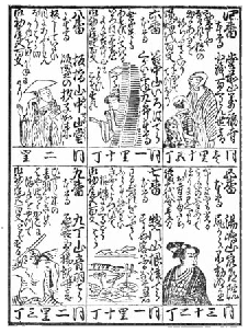 七番 惣門山根津てら 本尊 すかぬ客ハふるな尊者 わるじゃれをいふてふらるる初くわいきゃく よつぴて根津にかへるごうはら 御初尾五百文 同一里十丁 八番 板橋山中山堂 本尊 飯盛の杓子如来 板ばしでいたい目にあふしわんぼう はら切かねを出しかねにけり 御初尾五百文 同二里