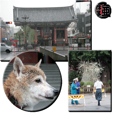 土砂降りの雨になってしまった雷門前です。傘を持って出なかったので、あほまろもモモちゃんも、瞬間的にずぶ濡れでした。