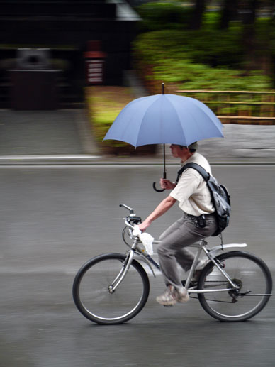 自転車の片手運転は違反なんですよ。今は、傘を固定する金具が売られていますので、それを買ったら如何ですか。