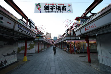 昨日は日曜日と羽子板市が重なったため、浅草はとっても賑わっていました。特に仲見世は夜まで満員電車の中に入り込んだような混雑だったのです。毎朝同じ場所を散歩していて思うのは、これが本当に昼間と同じ場所なのかな・・・、ってことです。当たり前なのでしょうけど、同じ空間を埋める人の数、いわゆる人口密度がこれだけ極端に変わるのってのが不思議というか考えられないというか、久しぶりに総てのお店が開いている仲見世を歩きながら、「ここは別世界なのかも」なんて思ってしまいましたよ。