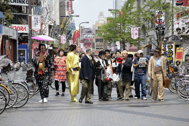 デン助の格好をした「浅草がんばる会」の代表、河野さんを中心に、デン助劇場復活のPRです。観光客のみなさん、奇妙な一団にカメラを向けてました。滅多に無いパレード、きっと浅草観光の思い出になることでしょう。