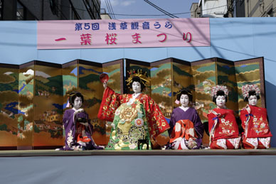 すっかり春の陽気になってきましたね。昨日なんかまるで初夏を思わせるようなお天気にめぐまれ、観音裏で開催された「一葉桜・小松橋通り」には、約3万人(主催者発表)の方が目玉である「江戸吉原・おいらん道中」のあでやかな着物姿に見入っていました。昨日の行事の様子は下の方にある「昨日の行事」でご覧ください。