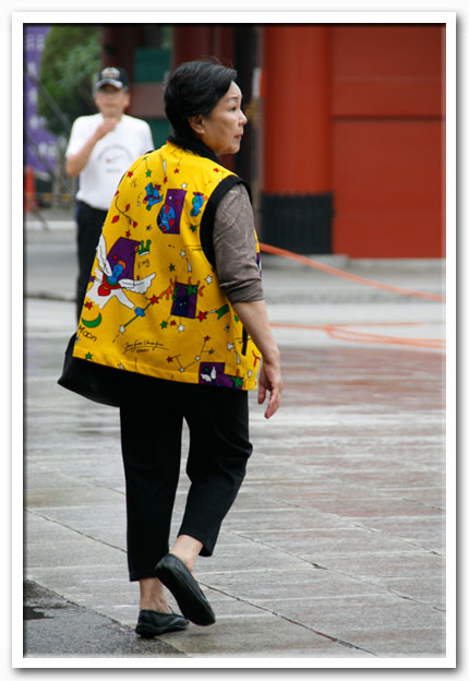 朝っぱらから変な事を考えてしまったのは、雷門の大提灯の底に派手な千社札が貼られているのを見付けたからなのです。どこでも売っている名字のシールの横に、京都祇園の舞妓さんのシールがあるのです。これって、貰った方が貼ったのか、それとも本人が貼ったのかは解りませんが、不規則に三枚も貼られているのです。こんな高い所に貼られるということは、よほど背の高い方だったのでしょうね。あほまろがここに貼ろうとしたら、絶対に脚立が必要な高さだというのに・・・。
