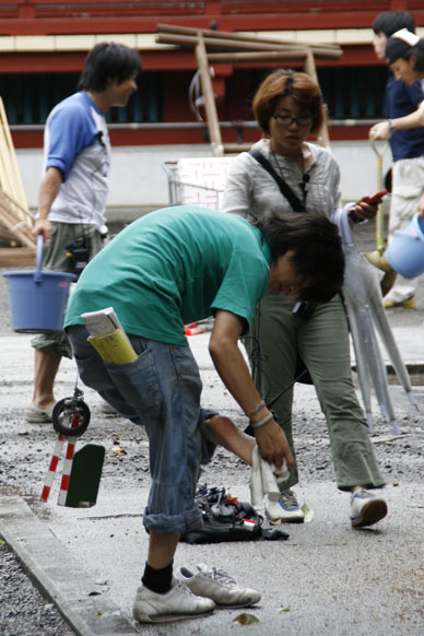 浅草寺では、「四万六千日」も終わり、ほおづき業者は総てが去ってしまいました。今朝は電線を取り外し、業者用の枠組みの片づけが始まりました。そんな境内を片づける業者に混じって、様子の違う連中が大勢うろついています。雰囲気からして、映画の撮影隊のようです。規模からいって、テレビのドラマでは無さそうだし、誰かに聞いてみよう。そう思ってスタッフのところに近づくと、なんと知り合いの制作部がいるじゃないですか。