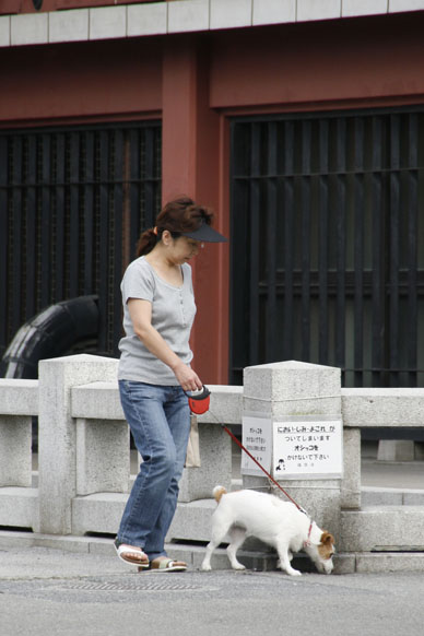 暑さが日増しに厳しくなってきましたね。今朝も猛暑の予感を感じながらもいつもよりちょっと長めの散歩を楽しんできました。こんな暑さの中をなぜ長めになってしまったかというと、今朝の浅草寺境内でロケが行われていたためにいつものような写真を狙うことができなかったからなのです。いつものように決まった位置の写真を撮ろうとすると、若い助監督が“写真を撮るな”と怒鳴りながら飛んで来るのです。冗談じゃないよ、あんたたちを撮ってる訳じゃないんだぞ!とはいっても、毎日の記録を欠かす訳にはいかないので、スタッフの目を盗んでいっぱい撮ってやりましたよ。そんな身勝手な撮影のおかげで、いつもの犬仲間たちもとっても迷惑そうに現場を小さくなって通り抜けていました。