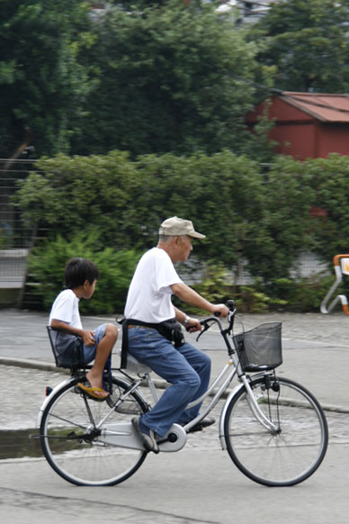 お爺ちゃんと朝の散歩かな。子供もワンちゃんのように毎朝散歩したいのでしょうね。
