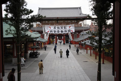 雷門の演技を終えた一行は、仲見世を通って本堂前にやってきました。