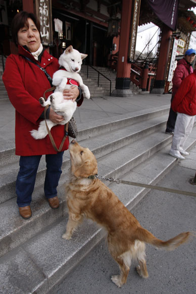 今朝は、浅草寺本堂で七草詣りが行われ、ちょうどあほまろと入れ違いに浅草の名士の方々が本堂から出てきました。