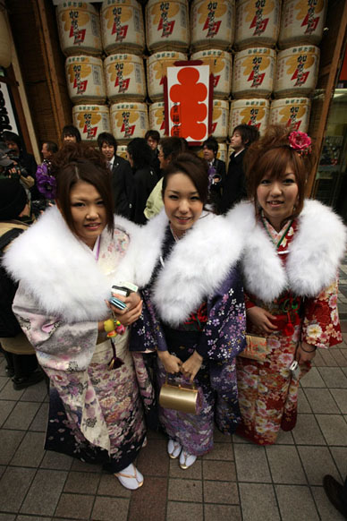 公会堂の式典を終えて帰って来た台東区の新成人さんたちです。お揃いの