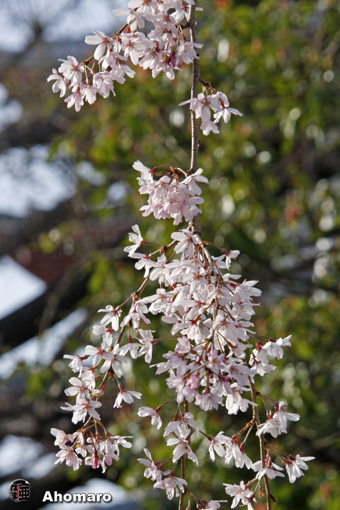 桜にすっぽりと覆われてしまった五重塔です。これから秋に葉が落ちるまでこの位置から五重塔を望めなくなってしまうのです。 こちらは影向堂の桜越しの法輪です。 今朝の空は、まんべんなく途切れ雲で覆われていました。 直射日光で見るより色が鮮やかでしたよ。時と角度によって、様々な表情を見せてくれるシダレザクラは、まだ満開を維持してますよ。 『今朝の浅草神社』 雨も風も収まったので、思ったより散り方が少なかったようです。 まだしっかり花を付けていますが・・・。 良く見ると、所々に葉が出てきましたよ。 桜の花が散ると同時に、この葉が開くのです。 写真を撮っている足元に、ムクドリがやってきました。 水溜まりの水を飲んでましたよ。それを見ていたモモちゃんも、水溜まりをぺろぺろ。汚いけど、ムクドリの真似したかったのでしょうね。 この辺が今年最初に開花した枝、ちょっと散ってますね。