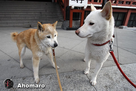 ナナちゃん、今日は桜の下で記念写真を撮ってあげたかったのですが、モモちゃんがのろまなので、境内まで一緒に行けませんでした。 |