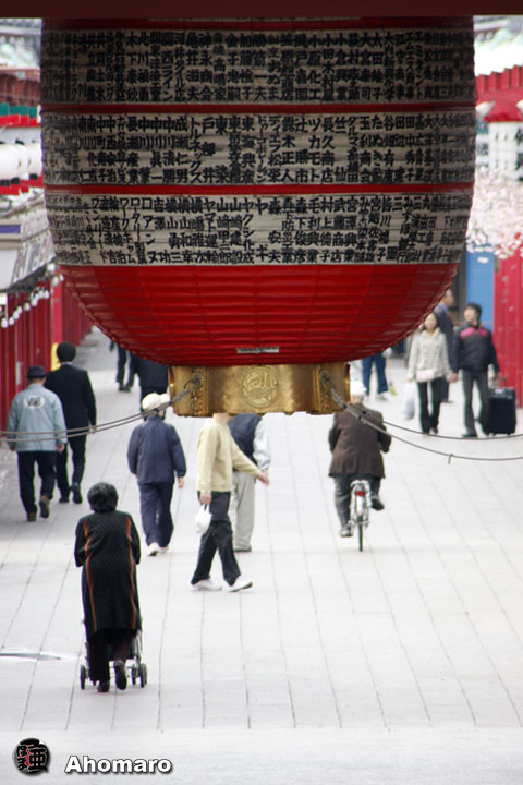 まだ「桜まつり」の開催中だというのに、雷門前に並んだピンクの幟が撤去されてしまいました。いったどうしたのでしょうね・・・。そういえば、昨年も、この前で撮影をするために一端撤去したことがありましたよね。今日もこれから撮影が行われるのでしょうかね。 |