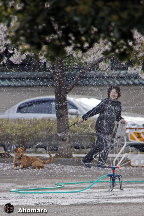観音裏広場に散水が始まったので、慌てて逃げようとするランディ君のおかあさん、でも、ランディ君は動こうとしないようでした。 |