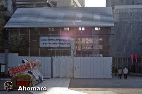 シラクラさんの「暫」。今朝も田中画伯が作業中でした。 前田食堂の「連獅子」。 さわだ屋さんの「藤娘」と早川さんの「勧進帳」。今朝も進展無し。 『昨日の行事』 昨日は、「隅田川着物園遊会」が開催されたので、浅草中に和服姿の女性があふれてましたよ。 外国人観光客のみなさん、和服の女性を見つけるて一緒に記念写真です。香港からの観光客のようでした。 あっちもこっちも和服、和服。あほまろも和服を着たかったのですが、写真を撮らなければいけないので・・・。え、和服有るのっていってますね。はい、ちゃんと持ってますよ。それが結構、様になるんですよ。 浅草神社の着物園遊会の受付です。 東京きものの女王様と記念写真を撮っているのは、かつてのギター侍かな。 せっかくの女王様も直射日光とシャドーがきつくて、おきれいに撮れませんでしたね。 浅草神社の能舞台では、十二単の着付けを行っていました。モデルはそれなりに高貴なお方なのかな。お顔はそれなりでしたけど・・・。 隅田公園の会場では、野点や帯締め実演なども行われていました。 スタンプラリーのチェックポイント。 伝法院では、「投扇興の集い」が開催されました。 競技開始前に、前回の優勝者により模範演技が披露されました。 みなさんとってもお上手ですね。 扇が蝶に当たって落とすと花散里で何点とか、当たらないと手習いにつき無点とか、源氏物語からとった風流な言葉が飛び交ってましたよ。 この日は伝法院のお庭も開放され、参加者は都会のど真ん中とは思えない春のひとときを楽しんでました。 競技会は、個人戦、団体戦とで争われました。 浅草芸者さんたちは、踊りや音曲のお稽古同様、手習いのひとつとして投扇興も練習されているのです。7月には、観音裏の見番において、「投扇興とお座敷おどり」も開催されます。みなさんも芸者衆と対戦してみませんか。