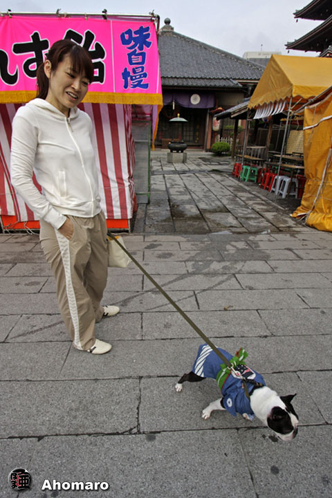 三社祭で浮かれているあほまろの空気を読んでくれたのか、モモちゃん、元気に歩いてくれましたよ。おまけに、今朝の境内に集まるワンちゃんたちも祭半纏を着ているのです。服を嫌がるモモちゃんも、祭くらいは半纏を着せてもらいたいな・・・、とか、半纏姿のワンちゃんたちに近寄って三社祭の話しをしているようでしたよ。“祭はうるさいけど、みんなが幸せそうなので我慢しようね”。 本社御輿の出ない三社祭。始まってしまえば地元町会は例年と何ら変わることのない盛り上がりで町御輿で練り歩いたのでしたが、見物客はかなり少ないようです。最も、例年も土曜日には本社御輿が出ないのですが、マスコミ各社が繰り返し本社御輿が出ないことを報道したこともあって、三社祭を知らない方々は、御輿そのものが出ないお祭りと勘違いをしてしまったようです。そのおかげで、臨時屋台でビールやお弁当を売っている食堂や、コンビニなども仕入れ過ぎたのか、夕方に成る前から安売りを呼びかけているのでした。人出が極端に少ないのは、仲見世を歩いていても実感しました。普段ならたとえ町御輿であっても、人並みに押され、御神輿の前に脚立を立てて構えるなんてことは出来ないのですが、昨日は、のんびりとそんな撮影が出来てしまった。ま、あほまろにとっては、人出が少なかったことが幸いしたのではありますが、お店の方にとっては傷手だったことでしょうね。 昨日も、20年ぶりに三社祭見物に訪れたという老夫婦、“御神輿がこんなに出ているじゃないですか・・・”、なんて驚いてたことにも頷けますね。本社は出なくても、浅草神社氏子44ヶ町会の御神輿総てが浅草中を練り歩いているのです。報道で勘違いをしてしまったみなさん、今からでも遅くないですよ。特に今日は、本社が出ないことで、町御輿が例年以上に盛り上がりを見せてくれるようです。