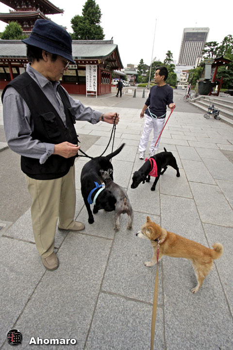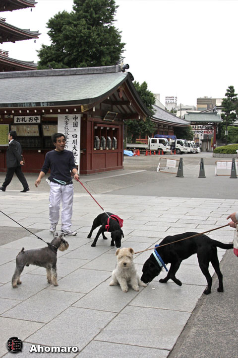でも、それからが通常のお仕事なんです。通常といっても現在はとってもご存じの通り通常とはいえない撮影の仕事、夜まで気が抜けない毎日。ですが、この日記をアップし終えると、今日も使命を全うした充実感も伴って、眠気が一気に襲ってくるのですよ。 三社祭が終わって半月が過ぎようとしています。浅草の各町会の方々は直会とかお疲れとかと、今になってもまだ飲み会が続いているようです。あほまろも色々お声がかかっていたのですが、今年はどこにも顔を出すことができません。昨日も仲見世町会の青年部のみなさんが、一泊二日で札幌に行ってきたとおみやげを持って来てくれました。昨年は確か福岡でしたよね。わずか一泊二日の旅行なんてもったいないようにも思えますが、たまには浅草を離れた土地で羽目を外すのも良いことなのでしょう。今年のあほまろの本当の直会は映画が完成予定の10月末になってしまうのでしょうね。その時には、仲見世青年部のみんさんも全員誘って盛大にやりましょうね。 今朝の散歩も浅草寺本堂開門前でした。6時の鐘と同時に本堂の扉が開き、朝のお勤めのお坊さんたちが入ってきました。おやおや、今朝の主任はココアちゃんのお父さんじゃないですか。おまけに、従者として住職のお世話をしているのは息子さんです。お父さんがいないのでココアちゃんとはお会いできないのかな・・・。そんなことは有りませんよね。本堂を出ようとした時、ちゃんとお母さんがココアちゃんを連れて入ってきましたよ。お父さんもきっと、お経を唱えながら気になっていたでしょうね・・・。まさか後ろを向く訳にもいかないし・・・。