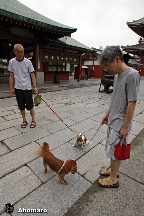 道路が濡れているところをみると昨夜は雨が降ったようですね。おかげで涼しくて爽やかな朝の散歩になりました。モモちゃん途中までは元気でしたが、仲見世に入った瞬間から相変わらず歩かないのです。いつもここで抱っこされるのが当然、そんな顔してあほまろを見上げているのです。全く困ったモモちゃんだよね。 |