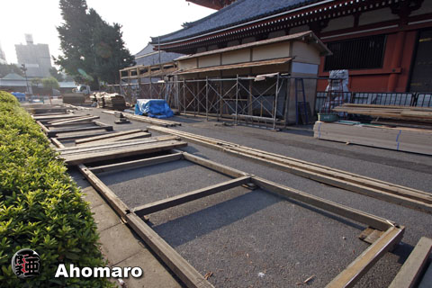 秋深き・・・。夏のジメジメ感が薄れ、カラッとした朝は気持ちが良いですね。おかげで、今朝のモモちゃん、我が家を出た瞬間から元気に走るように歩いてくれましたよ。それは良いとして、最近はあほまろの方がお疲れ気味なんです。昨夜も早く床に着いたのですが、あれこれ考えているうちになかなか眠ることが出来なかったんです。おまけにカメラにメモリーカードを入れるのを忘れるし(でも、かつての反省から、最近は通い袋の中にちゃんと予備を入れていたので大丈夫でしたけどね)、喉が渇いたので自動販売機で水を買ったは良いけど、ボトルを取り出すのを忘れて引き返したり、モモちゃんの元気さとは裏腹に、あほまろはまぬけでしたよ。 今、この日記を書いている途中にもウトウトしてしまうほど寝不足気味なんですよね・・・。そんな時はあたまの回転も鈍っているので、まともな文章も書けなくなってしまいそう、なんてこと理由にしたところで、これまでの日記もみんなまともな文章では無いんですけどね。 毎年、12月になると雷門の真ん前の並木通りの中央分離帯に五重塔や三社祭を描いたイルミネーションが光ます。それがもう取り付けられました。これも来月から始まる「浅草大観光祭」に花を添えようと早めの設置がなされたのでしょうね。すでにご存じの通り、今年は浅草寺本堂落慶50周年記念大開帳が行われます。大開帳の期間中は、普段は公開されていない伝法院の庭園と、浅草寺に伝わる寺宝も一般公開されることで、普段よりも多くの観光客が訪れるとこでしょう。一日中浅草で遊び、暗くなっても観光客の目を楽しませてくれるのですね。 それは良いとして、実は・・・、この中央分離帯の植え込み一帯がモモちゃんの朝の用足し場になっているのです。今朝のモモちゃん、あれ、もう始まってしまったんだな・・・、ここでの用足しは遠慮し、道路で済ませてしまいましたよ。年をとるに従って神経質になるモモちゃん、いつもと違う雰囲気に敏感になっているので、これが設置されている間の用足しは、ちょっと離れた別の場所にしなければいけないんですよ。そのためにはもうちょっと早く散歩に出かけなくっちゃ・・・。あぁ、またまた寝不足が溜まってしまいそうだよ・・・。 浅草寺境内の垣根の柱に誰かが落とした自転車のカギがぶら下がっています。その横に、「平成本堂大改修ご寄進のお願い 一口壱万円」と書かれた紙に赤字で「わすれ物」、まるで自転車のカギを拾ってあげたのでご寄進をお願いしますとでもいってるようで、これって何か「まぬけもの」ですよね・・・。
