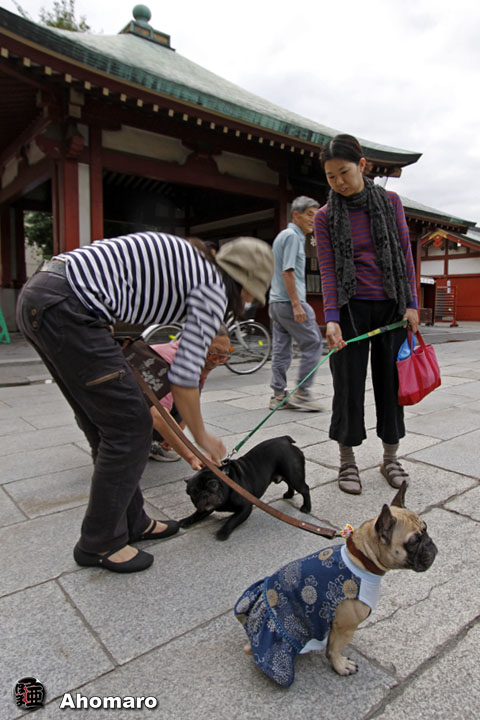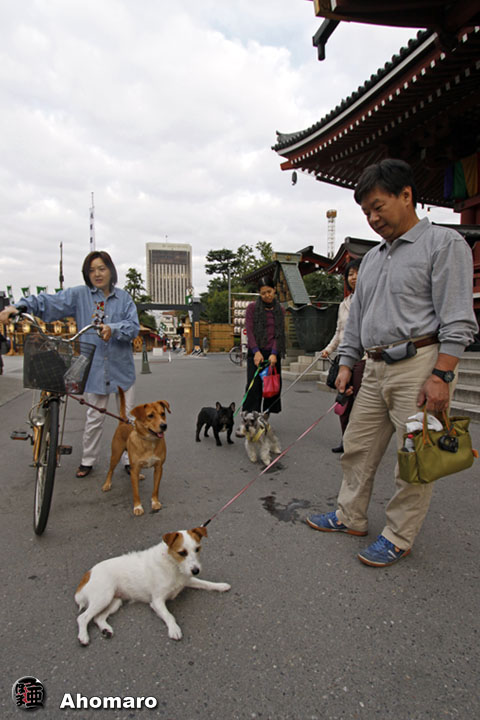 おや、モモちゃん、そんな格好で苦しくないの。毎朝、お逢いするラジオ体操のみなさんが心配して声をかけてくれますが、モモちゃんに語りかけているんじゃ無く、あほまろにちゃんと抱っこしてあげなさいよ。なんて言われているようで困ってしまいます。そのたびに、モモちゃんは背中が痛むようなので・・・。そのつど弁解、弁解、やっぱりまたカートを引っ張り出さなければいけないのでしょうかね・・・。とはいえ、浅草寺境内でワンちゃんたちに出会った途端から、抱っこしなくても自力で歩いてくれるのです。それも、浅草寺本堂に上がる階段、何度も何度も落ちながらも自分の足で上がりたくなってしまうんですよ。それは良いとして、降りるときが大変、ほとんど転びながらというか、ただ下まで落ちているって感じなんです。抱っこされるのを嫌がるので、それはそれで楽しんでいるのかも知れませんね。でも、痛そうですけどね・・・。
