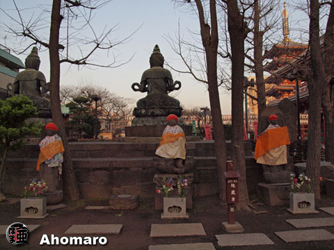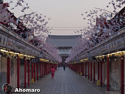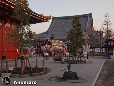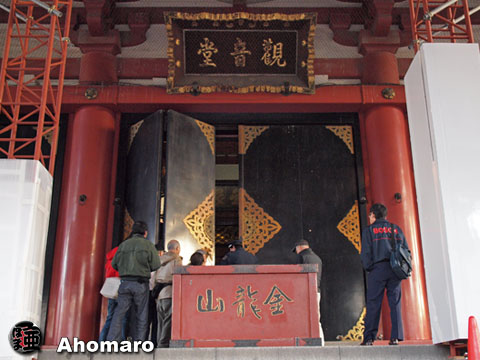 浅草寺本堂は、6時半に開門します。 いつもの早朝参拝のみなさんたち。 改修工事でどんどん被われていく浅草寺本堂です。 もう五重塔も見えなくなってしまいましたよ。 『本堂から宝蔵門』 『本堂から宝蔵門の大提灯』 ラッテちゃんが走ってきますね。撮られているのを気付いて無いみたいでしたよ。