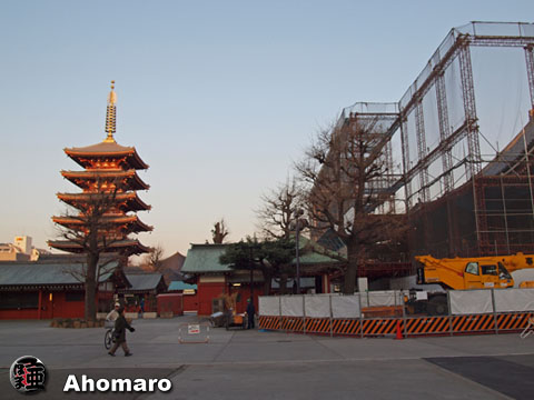 本堂の覆いがどんどん高くなっていきます。足場が完成すると、ここに絵が描かれるとか。いったいどんな絵になるのかな・・・。 |