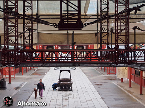 雷門前も強風が吹き荒れています。ナナちゃんも顔を歪めながら着いて来ますよ。そういえば、台風の時のモモちゃん、ここにしゃがみ込んだまま動いてくれなかったこともありましたよ。 |