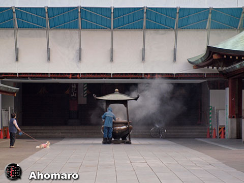 本堂正面の三分の一がシートで覆われました。 本堂正面は更に暗くなってしまいましたね。もう、メイちゃんが来てますね。 昨日は雨上がりだったので、メイちゃんはお休みしてしまったんだよね。 今朝の鐘楼が早かったので、開門がもたついてしまいましたよ。 今日も良い日でありますように。 本堂東側もシートが取り付けられました。 こちらは三分の一が覆われた正面側です。 西側はまだシートがありません。 今日は浅草寺幼稚園の子どもたちによって、鯉のぼりの掲揚が行われます。昨日まで覆われていたポールの周りも片付けられましたね。 『本堂から宝蔵門』 開門前の本堂前です。 開門後です。参拝を終えてお帰りになる方と、お散歩に来たいつものワンちゃんたち。 『本堂から宝蔵門の大提灯』