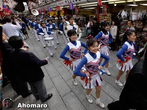 『今朝の浅草神社』 『早慶レガッタ・安全祈願』 隅田川の春の風物詩、早慶レガッタは’本日開催されます。 昨日、流鏑馬が終わった午後3時より、早慶レガッタの選手と応援団のみなさんが、浅草寺に安全祈願のパレードを行いました。 今年の先頭は慶応のチアガールです。 ブラスバンドに続いて、選手と関係者のみなさん。 次に早稲田のチアガールです。 早稲田のブラスバンド。 仲見世に掲げられた「第78回早慶レガッタ」の看板の下を。 参拝で訪れた方々、今日は偶然2つのパレードに遭遇することができましたね。 早稲田を応援してくださ〜ぃ!黄色い声のチアガール。 絶対、慶応だよ〜! 浅草寺交番前でエールの交換。 この7年間、ず〜っと早稲田が勝っています。 何事が起こったかと、大勢の人が集まってきました。 こちらが慶応ナインです。 こちらは早稲田ナイン。 キャプテン同士の握手で、いよいよ決戦です。