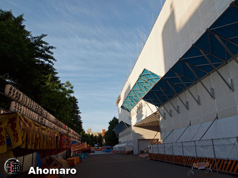三社祭の間、工事はお休みです。 メイちゃんがこっちを見てますね。 はい、開きましたよ。 モモちゃんの冥福と、家族の健康をお願いいたします。 この場所の機材も一旦片付けられるようですね。 ここが通れるかどうかで、かなり違って来るのです。 作業所のスローガンが掲げられました。 『本堂から宝蔵門』 開門前です。 そしてお参り後。 『本堂から宝蔵門の大提灯』