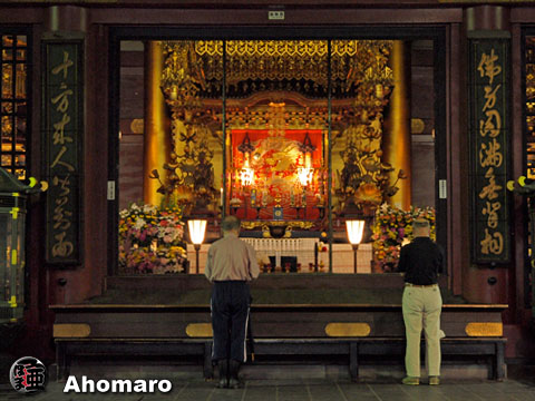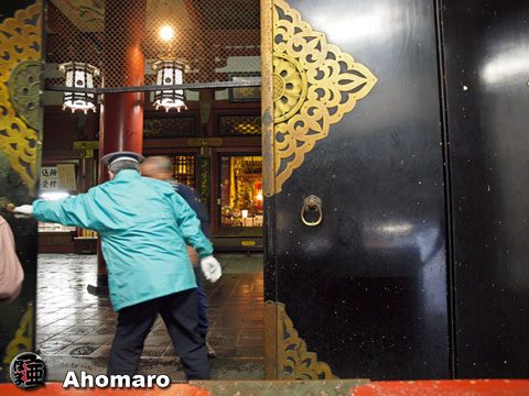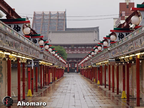 これも雨。 あれも雨。 たぶん雨。 きっと雨。 だって淋しいものよ、泣けないなんて、 そっと涙で頬を濡らしてみたいわ、 ひとりぼっちの部屋で・・・。 あぁ、モモちゃんが居なくなってしまったね・・・。 ちょっとブルーな雨の夢を見ている・・・。 『本堂から宝蔵門』 雨の朝の参拝客は極端に少なくなります。 今朝、開門を待つ方は、あほまろを含めて6名でした。 『本堂から宝蔵門の大提灯』 これも雨、あれも雨・・・。