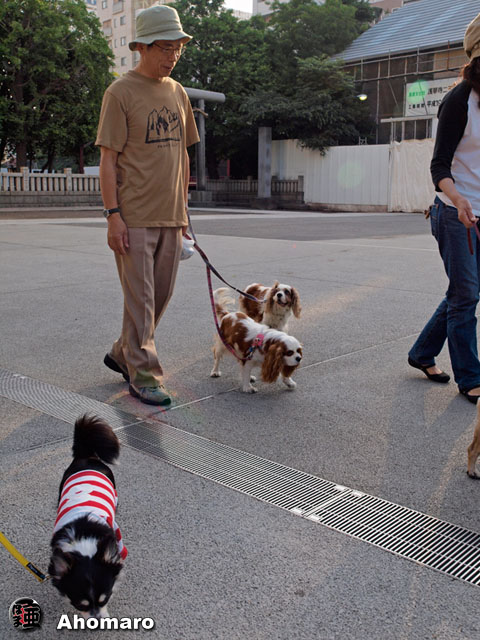 おい、犬のやつらは知らない連中でも平気で戯れているけど、オイラ猫族には考えられないよな・・・。遠くからナナちゃんたちをじ〜っと見ている猫ちゃんたちでした。