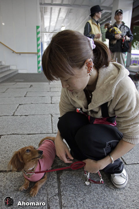 おじさんにリードを持たれ、不安そうなメイちゃん。