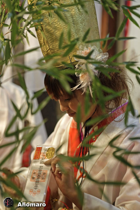 えべっさんの参拝は、まず本殿に参拝をし、社殿横で福笹を頂くのです。社務所の回廊にお揃いの着物の上に千早を着用し、頭には金の烏帽子を付け、ずら〜っと並んだ福娘の中からお気に入りを探し、その娘さんから福笹に縁起物を付けていただくのです。