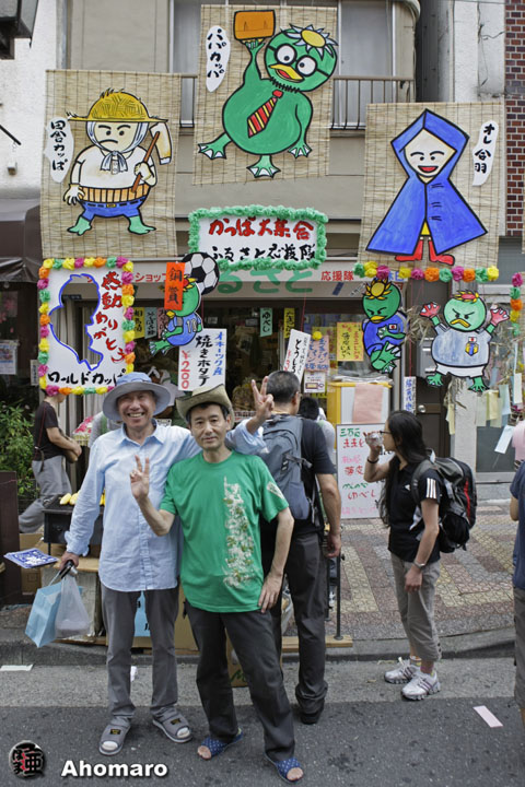 かっぱ橋本通りの有名人、田中画伯と原画伯。今日は、似顔絵を描くパフォーマンスも開催されますよ。