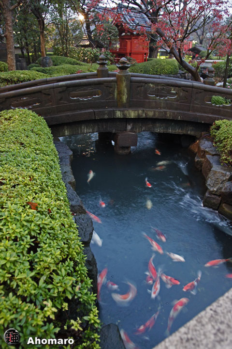 そして影向堂。いつも鯉が集まってきます。
