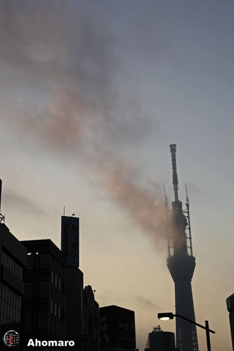 ナナちゃんが居ないんだけど、いつもの時間の散歩は欠かせません。今朝、我が家を出たのは午前5時10分、玄関を出てすぐに東京スカイツリー見上げる癖が付いているあほまろ、今朝は驚きましたよ。東京スカイツリーの第一展望台と第二展望台の間から、煙がモクモク上がっているのですよ。