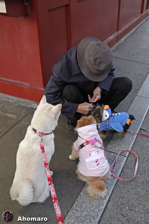 本堂前では、いつものおやつおじさん。バビちゃんとアイちゃんもお座りをしておやつ貰ったよ。