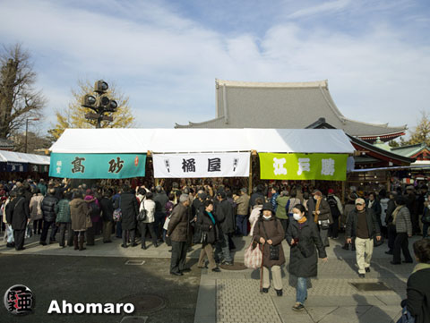 昨年から「羽子板市」の会場は、五重塔下に移されたため狭くなってしまいましたが、それでも今年は約20軒の羽子板売りの屋台が設置されました。