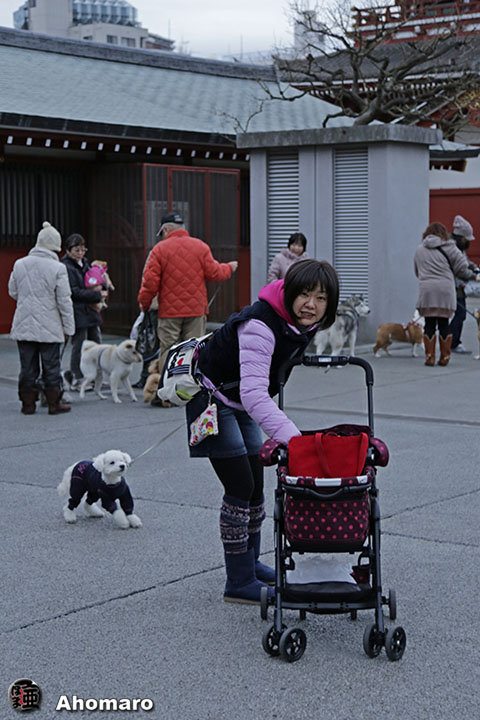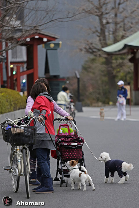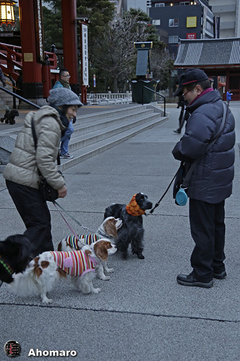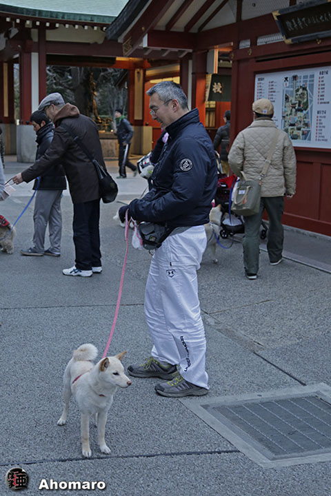 浅草神社で、ジョイ君がお参り中。