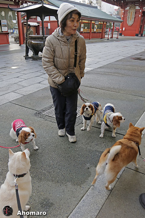 本堂前にランマル君、モモちゃん、ギンちゃん、柴犬三匹。