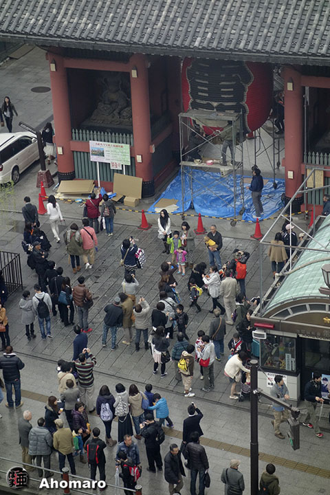 せっかく浅草に遊びに来られた方々、作業中なので記念写真に邪魔でしょうけど、こんな様子を見られるのは珍しいんだよ。