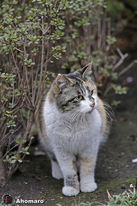 今朝の境内、三毛猫ミーちゃんお腹空かせて出て来たんだけど、