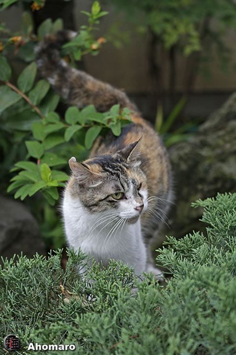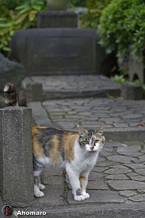 今朝の境内、三毛猫ミーちゃんお腹を空かせて出て来たんだけど・・・、