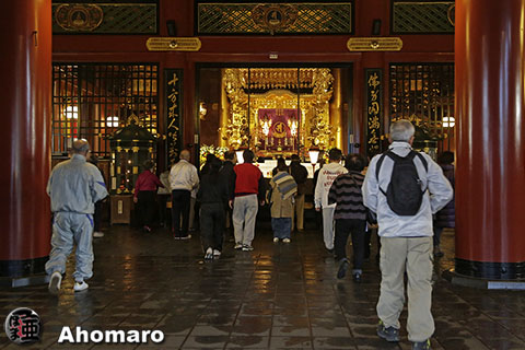 薄暗い本堂前に、もう参拝客が来てますね。