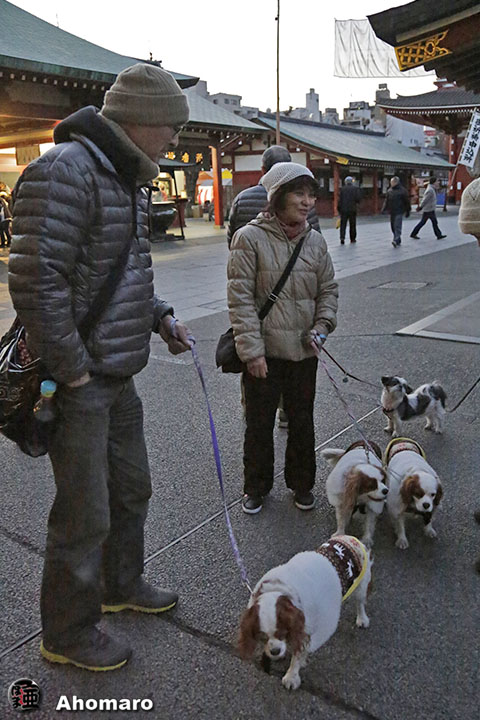 雷門通りでバビちゃんが待ってたよ。バビちゃんのおかあさん、ようやく帰って来たので喜んでたね。今朝は、お豆腐色のベッちゃんさんはお寝坊して来られなかったんだよ。