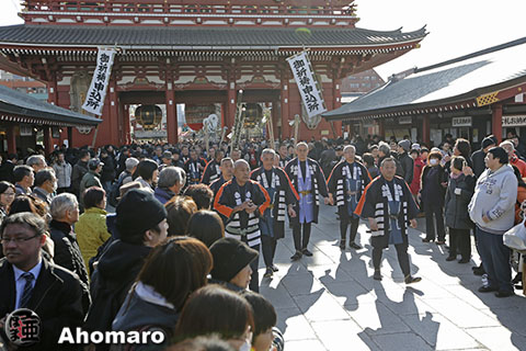 木遣歌を唄いながら仲見世を通り浅草寺本堂に向かいます。