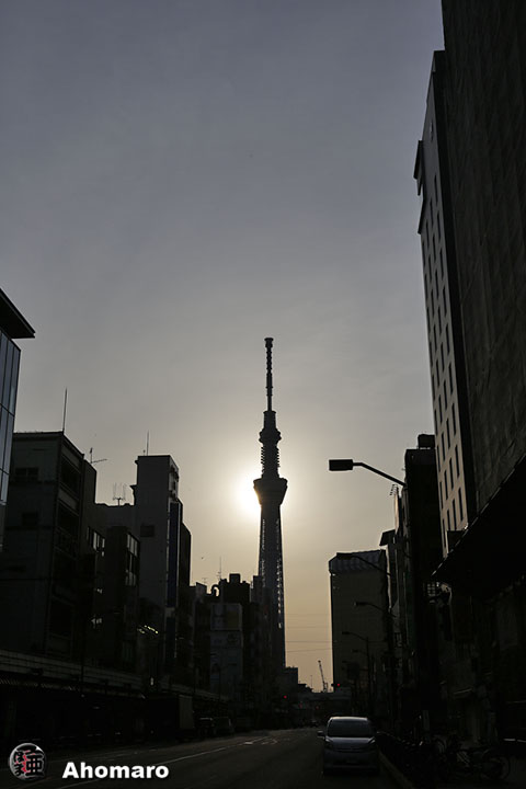 今朝の東京スカイツリー、真後ろに太陽が来ても例の影は出ませんでした。