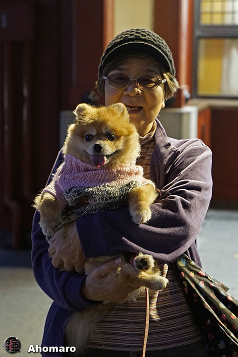 真っ暗な境内でジョイ君。