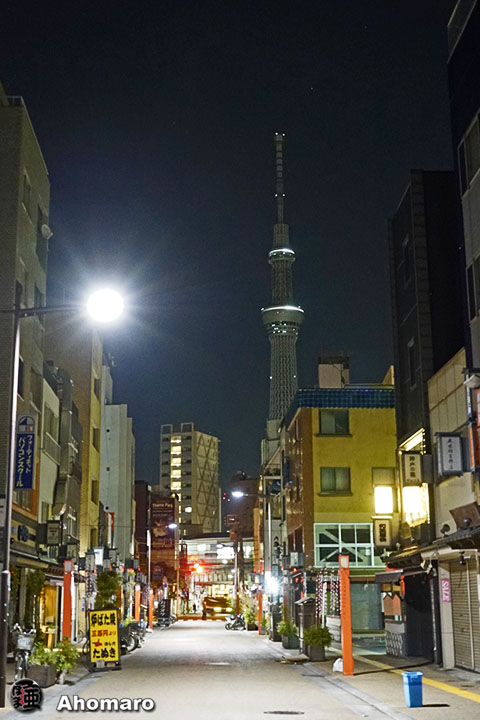 真っ暗な境内、スカイツリーをバックに鬼は進みます。